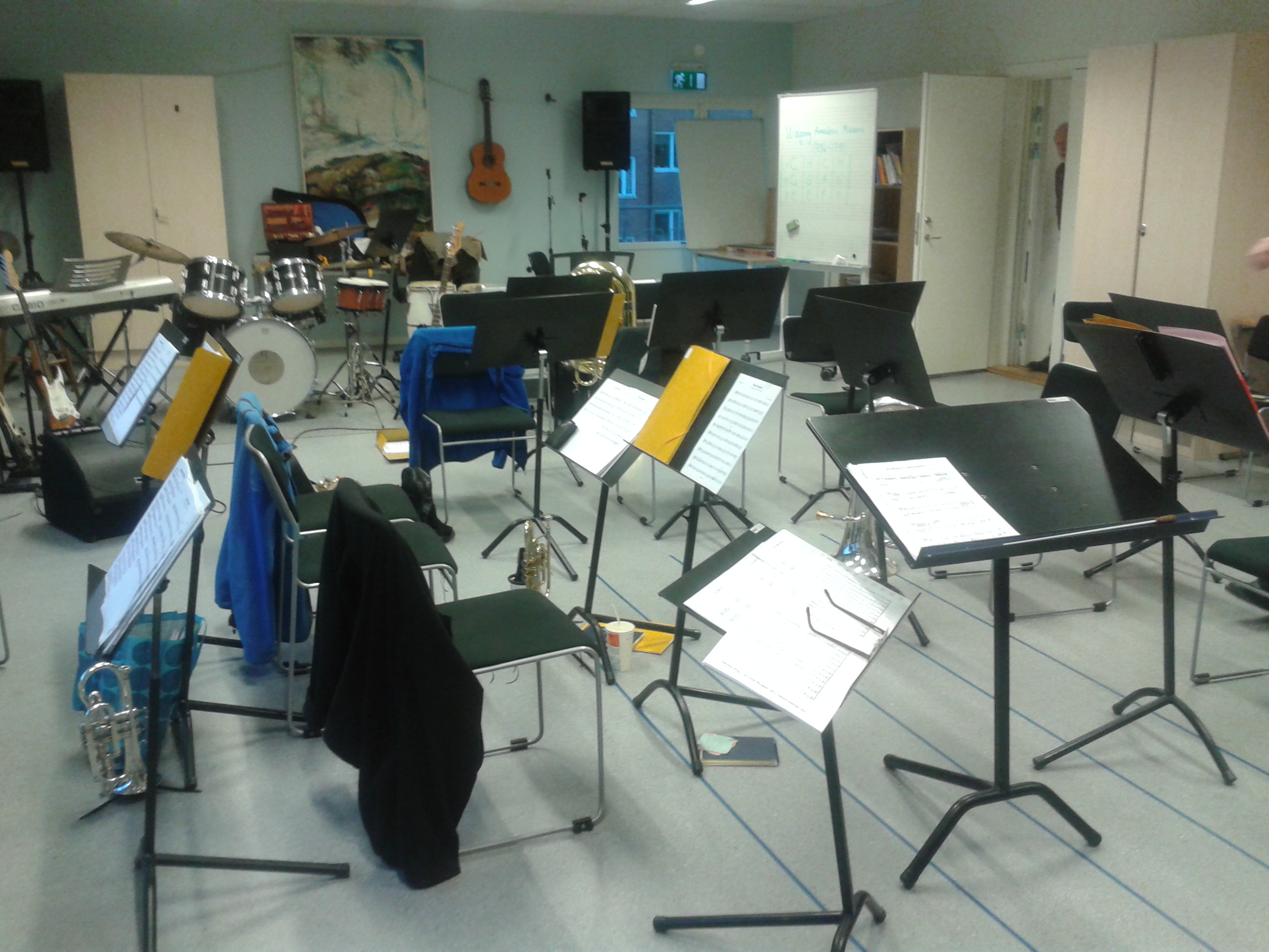 Vi planerar för en konsert som kommer att äga rum på biografen i Säffle lördagen den 1 december! Konserttiden är inte riktigt fastställd än men preliminärt blir det klockan 16.00. Vid denna konsert kommer en del av dirigenten Ulf Lagerbergs arrangemang för brassband att få sitt uruppförande. Ulf har under en tid experimenterat med att arrangera svenskkomponerad musik för brassband och det har blivit en hel del material under de få månader han varit aktiv inom detta gebit. Nedan en bild av repetitionslokalen i Musikskolans lokaler. Bilden tagen i en kaffepaus och kan exemplifiera begreppet ”Lugnet före stormen”…